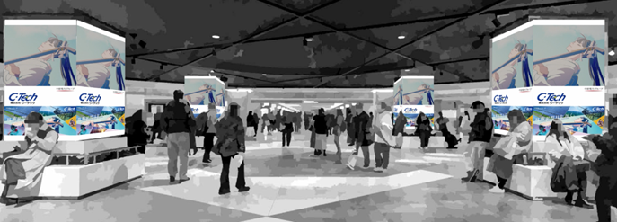 多くの人が行き交うサカエチカの「大同特殊鋼 Phenix スクエア」に設置された大型サイネージ(「サカエチカヒロバビジョン」)と東西北通路の天井に設置された32面のサイネージで、駒田 早代さんが津軽三味線で演奏するクラッシック音楽「チャルダッシュ」の迫力ある音と映像に乗せて、当社の技術で挑戦する姿を表現したCMをサカエチカでぜひご覧ください。
