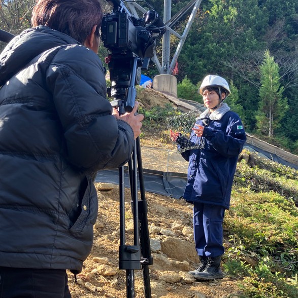 番組では、中部電力パワーグリッド(株)の送電鉄塔の敷地をKODOBOKU資材である「ストーンバッグ」などを用い補修する工事の様子が紹介され、当社従業員もインタビューを受けました。